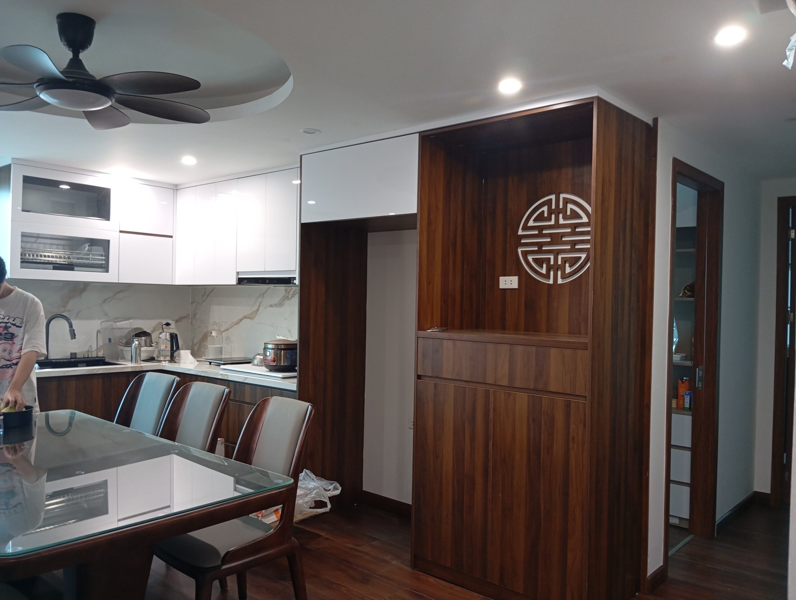 Vách ngăn cũ được loại bỏ để tạo không gian mở giữa phòng khách và bếp. Nhờ liên thông, ánh sáng tự nhiên lan tỏa sâu hơn vào căn hộ, giúp cảm giác rộng rãi hơn rất nhiều. Tủ bếp tông màu trắng – gỗ ấm giúp không gian sang trọng và hiện đại hơn