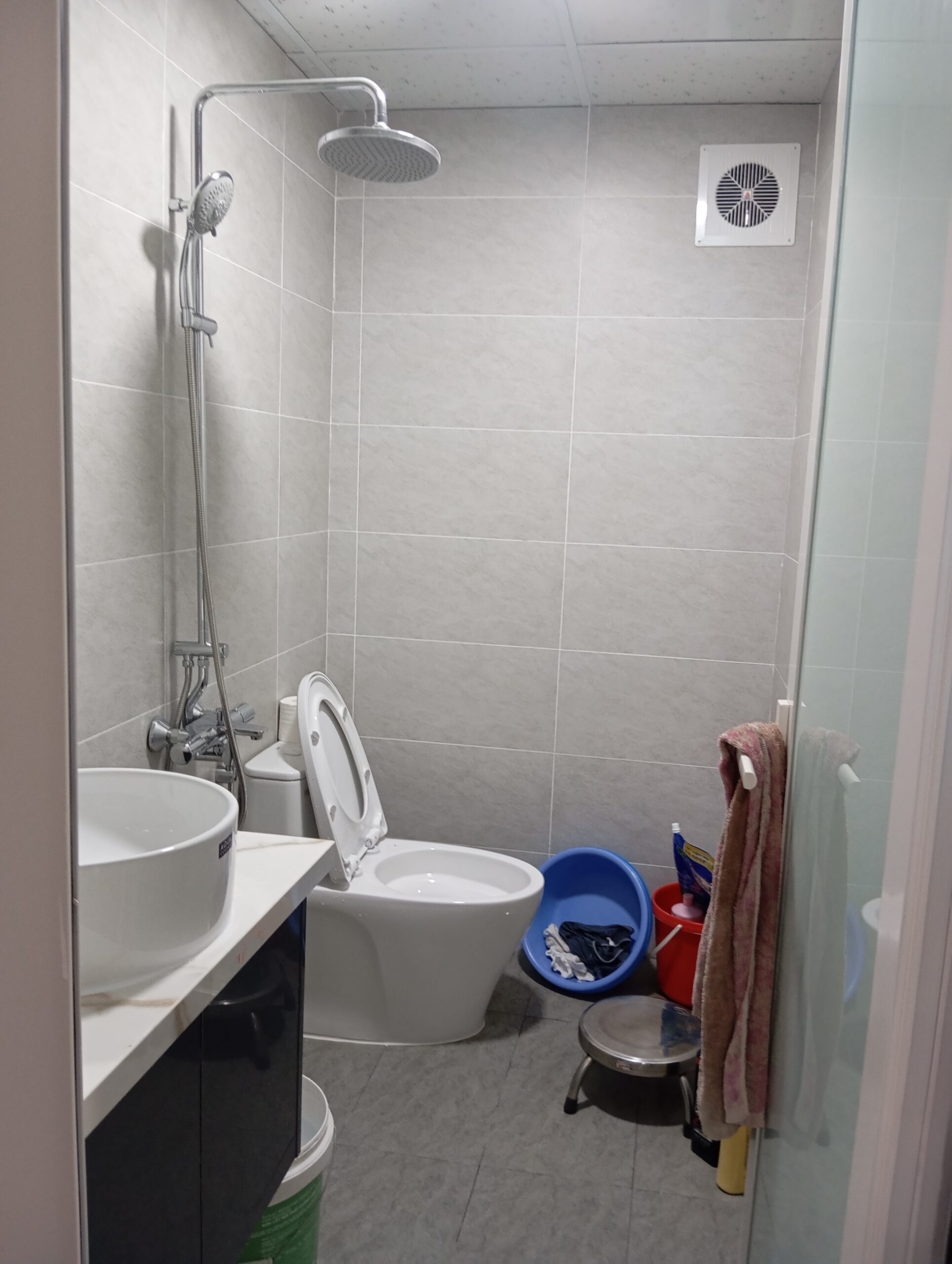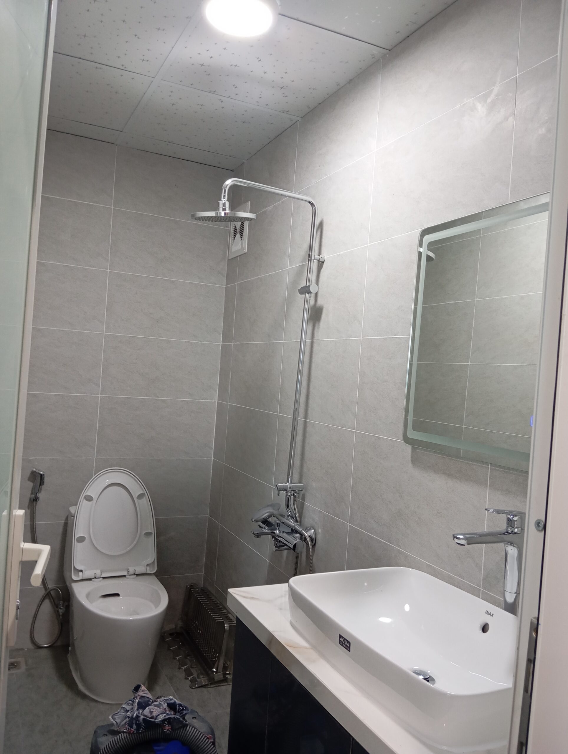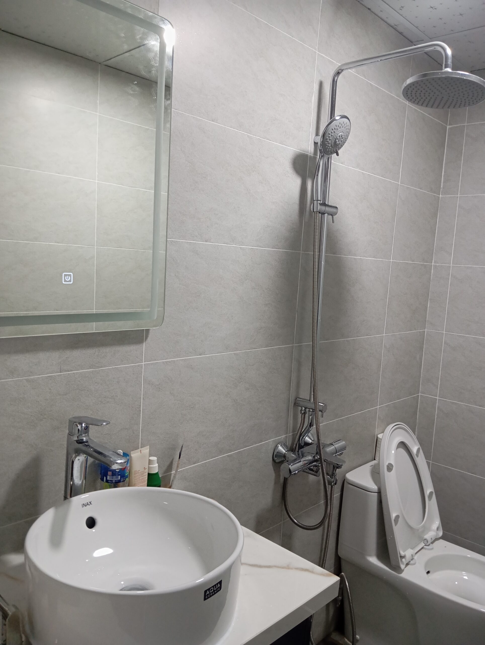 Nhà vệ sinh được thay mới hoàn toàn với quy trình chống thấm Sika 2 lớp, đảm bảo tối ưu khả năng chống thấm lâu dài. Gạch ốp 300×600 và sàn Prime chống trơn được lựa chọn để đồng bộ thẩm mỹ và tối ưu sử dụng.